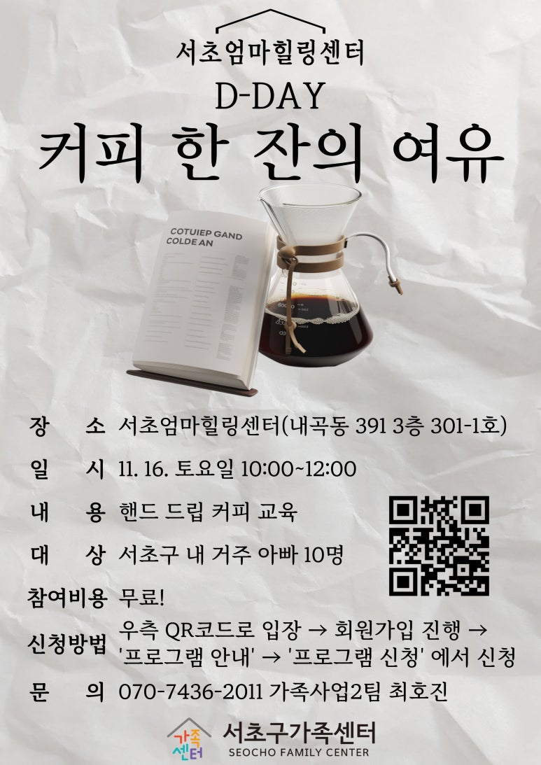 [서초엄마힐링센터] D-DAY 핸드드립 커피 실습 '커피 한 잔의 여유' 참여자 모집