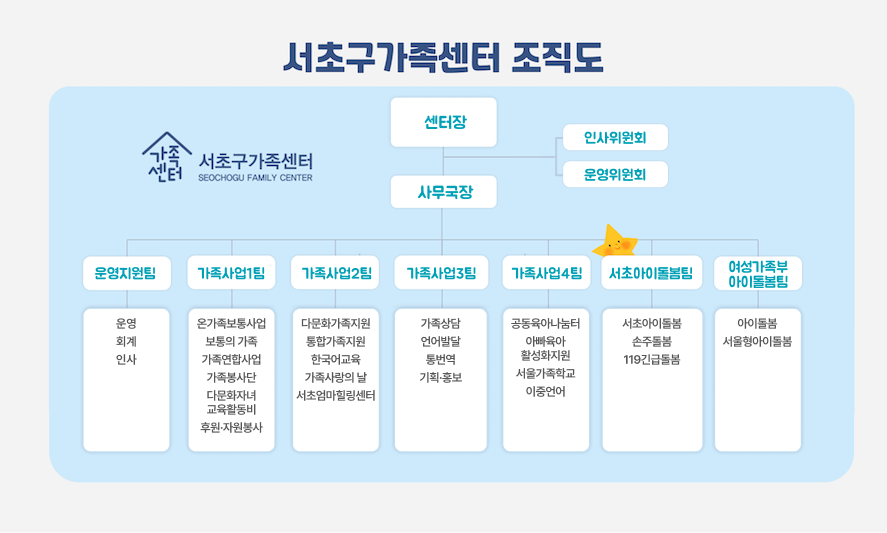 서초구가족센터 대표번호 : 02-576-2852 대표자 : 조혜진 등록번호 : 309-82-20777